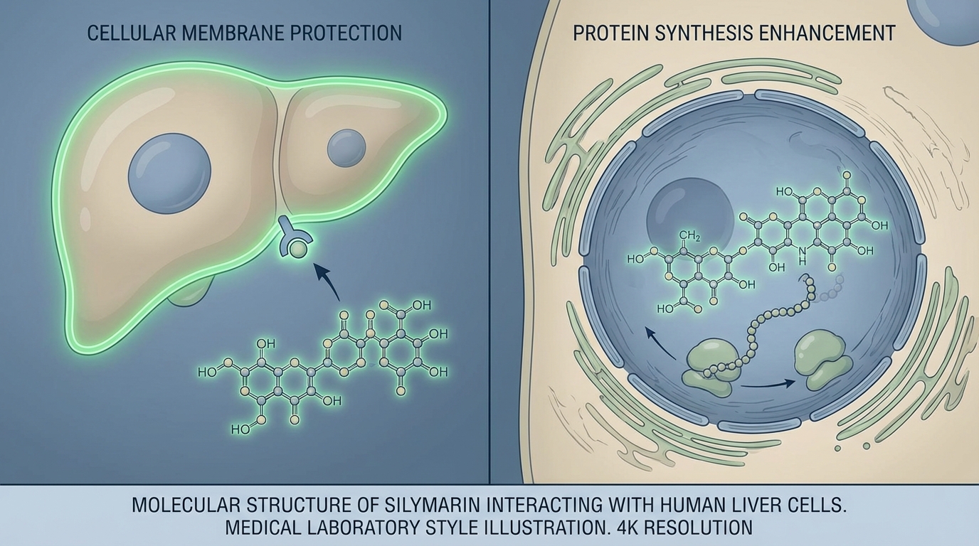실리마린은 간세포 내의 RNA 폴리머라제 I을 활성화하여 리보솜 단백질 합성을 촉진합니다. 이는 손상된 간 조직의 재생을 돕는 결정적인 역할을 합니다. 또한, 강력한 항산화제로서 간내 글루타치온(Glutathione) 농도를 유지하고 지질 과산화를 억제하여 세포막을 보호합니다.